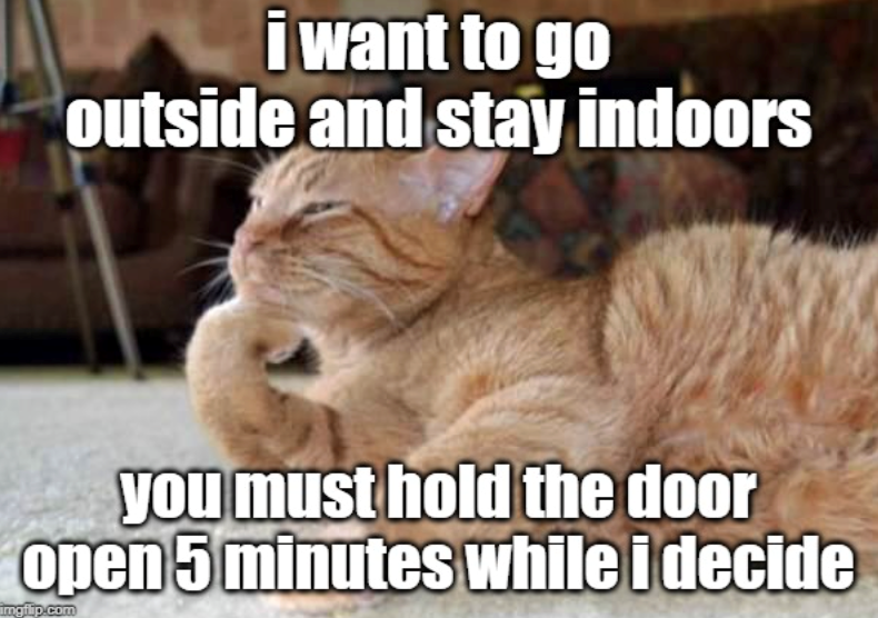 In or out, that is the question, and the cat never has the answer. They stand there like it’s a serious decision, thinking it through like it matters. One second they want out, the next they change their mind. You open the door and they hesitate, you close it and suddenly it’s urgent. Somehow they want both at the same time, and you’re the one stuck going back and forth trying to keep up.