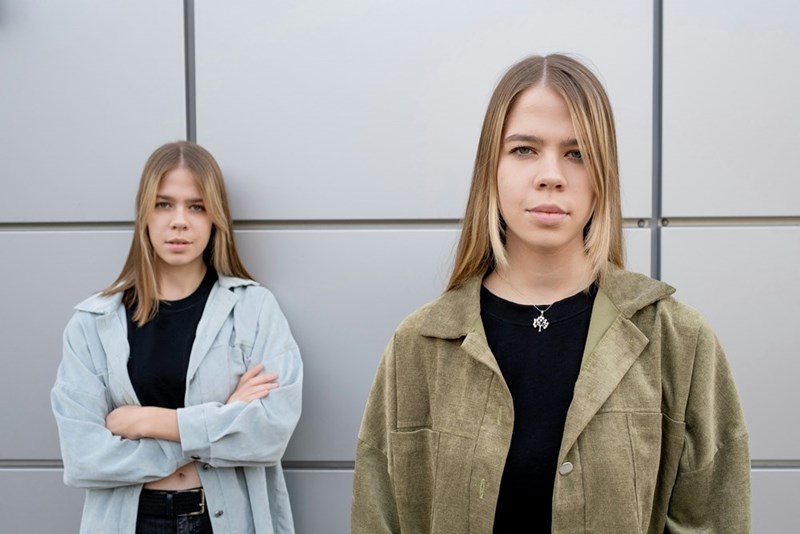 Twin sisters standing in front of the camera.