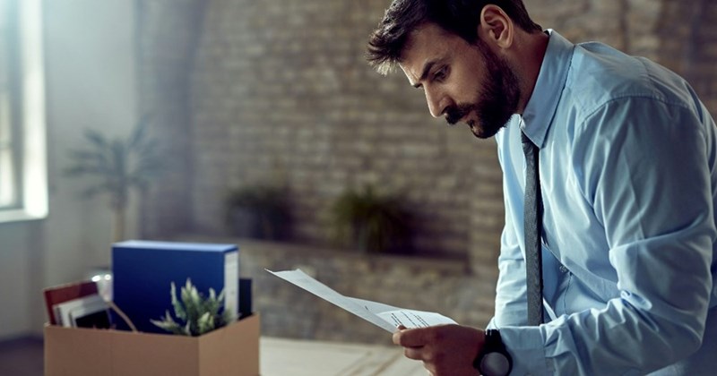 An employee looks at his resignation letter as he packs up his desk supplies at work.