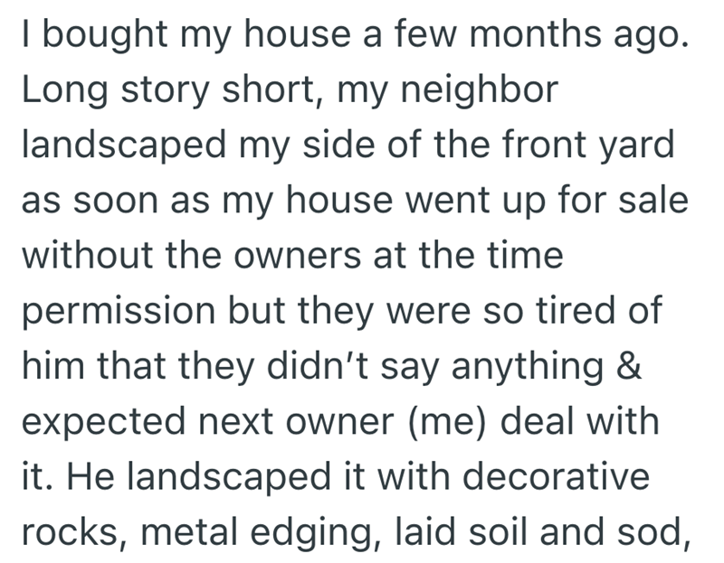 I bought my house a few months ago. Long story short, my neighbor landscaped my side of the front yard as soon as my house went up for sale without the owners at the time permission but they were so tired of him that they didn't say anything & expected next owner (me) deal with. it. He landscaped it with decorative rocks, metal edging, laid soil and sod,