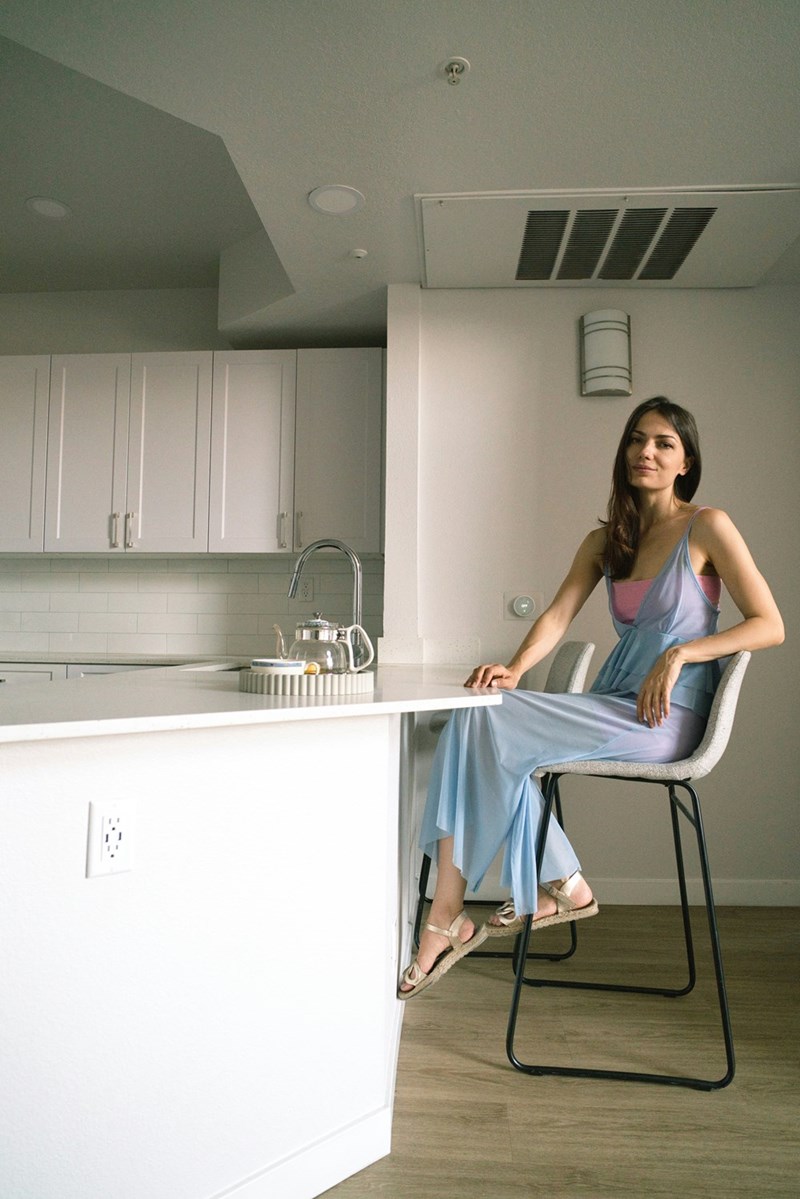 • Woman in light dress sitting on high chair at kitchen island in modern home interior.