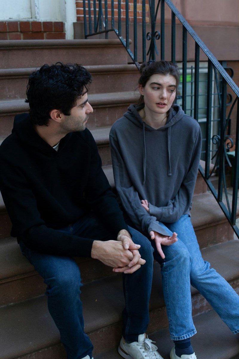 A boyfriend breaks up with his girlfriend on the front stoop of their apartment.