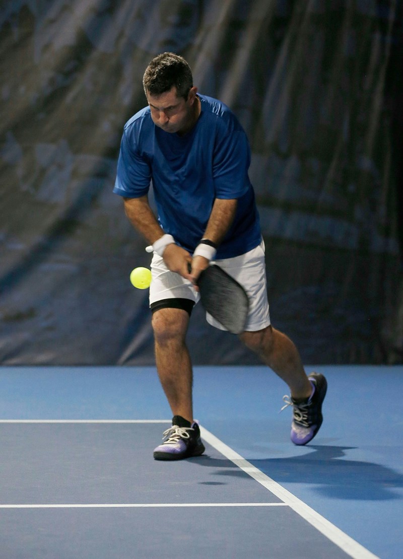 Man hitting a low shot with a paddle on an indoor court during a pickleball match.