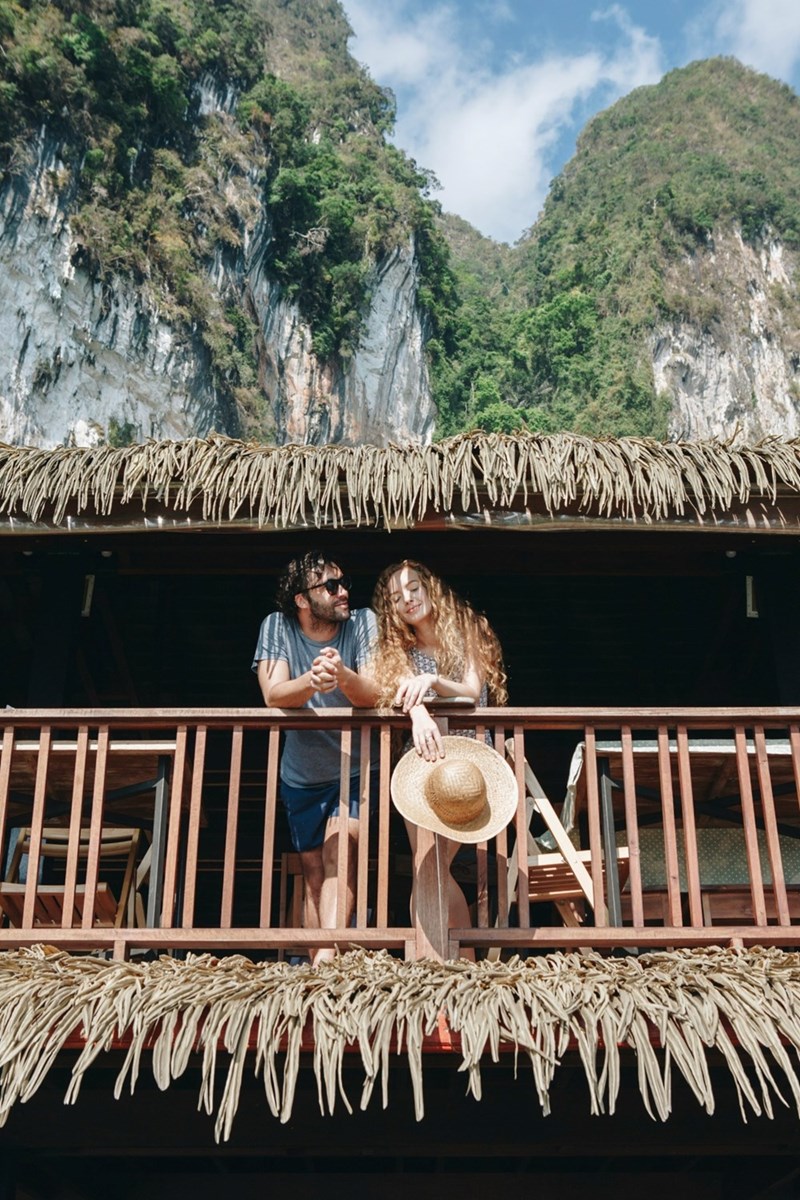 A male and female couple lean over a balcony on a tropical building, the woman holding a hat