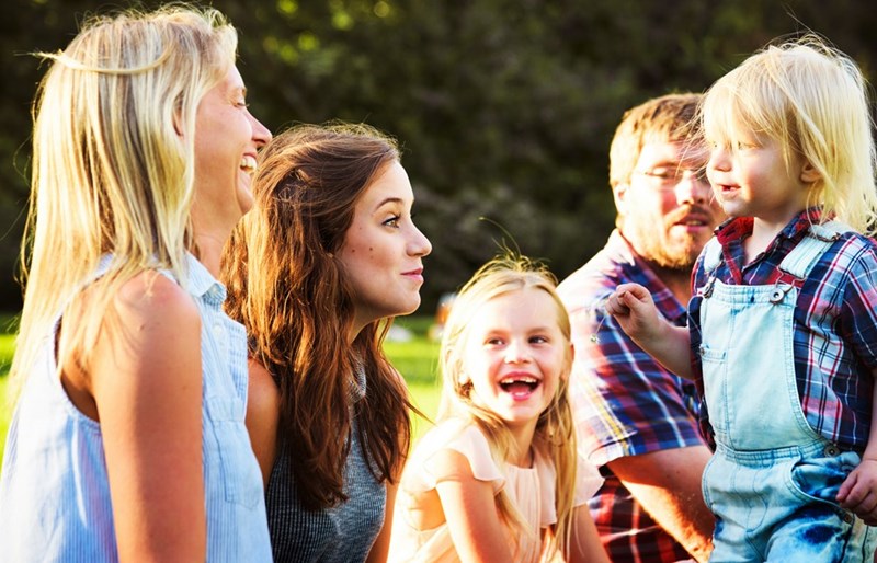 Large family with lots of siblings sit together outdoors.
