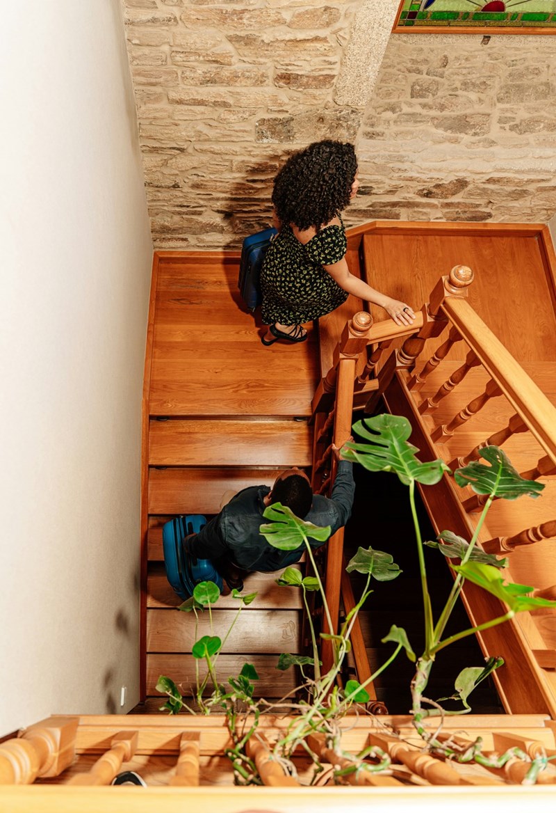 Couple climbs the stairs, searching for the right place to stay at.