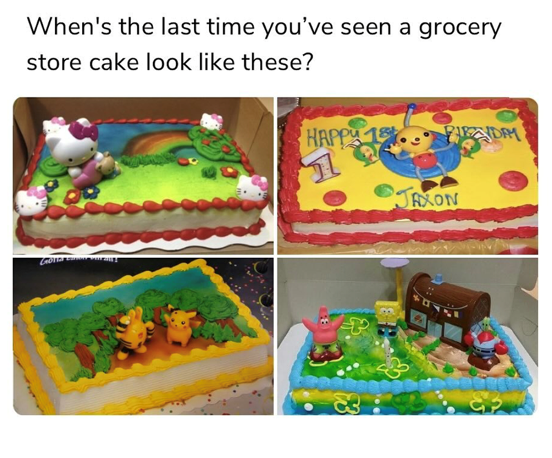 There was a specific kind of magic that happened when your mom pushed the cart past the bakery section at the grocery store. You were not there for bread. You were not there for muffins. You were there, in your heart, for that rotating display case, the one with the sheet cakes under plastic lids, sitting on cardboard, decorated with characters that felt like they had been pulled directly out of the TV and frozen in buttercream forever.