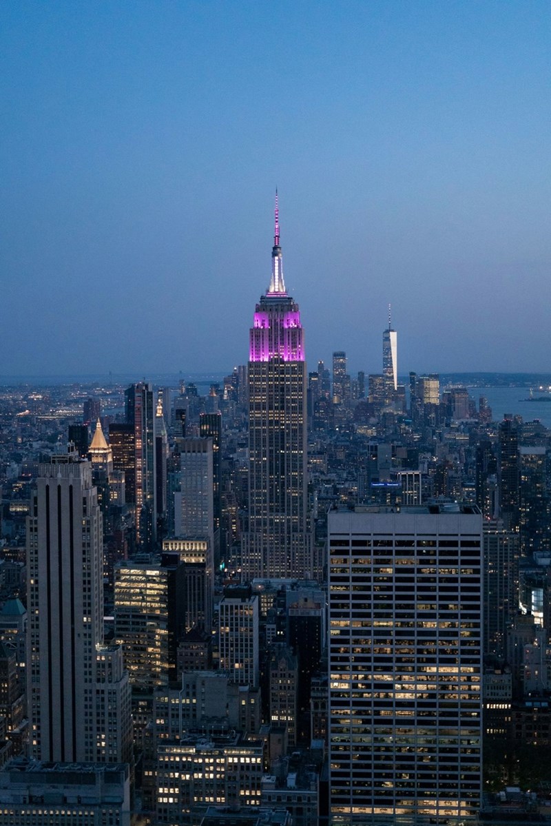 • The Empire State Building in the New York City Skyline, lit purple at the top