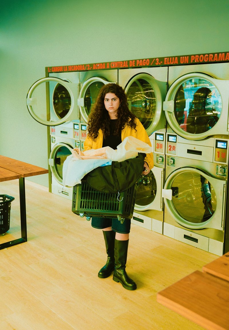 Curly haired woman holding a basket of clothes in a laundry room.
