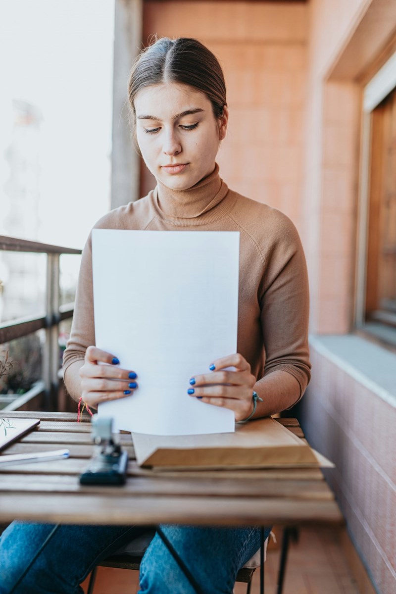 Young woman sitting at a table on a balcony, reading a document she's holding.