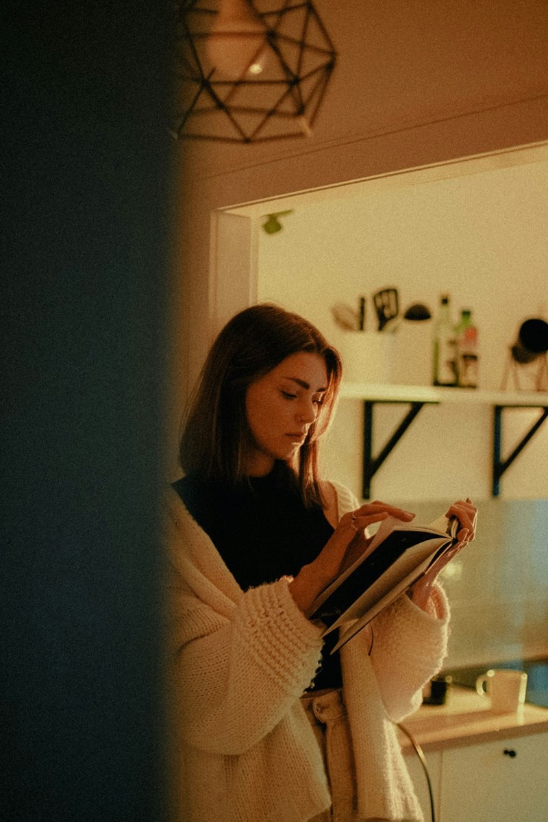 Woman reading a book in a warm-lit kitchen, wearing a chunky cardigan and focused on the pages.