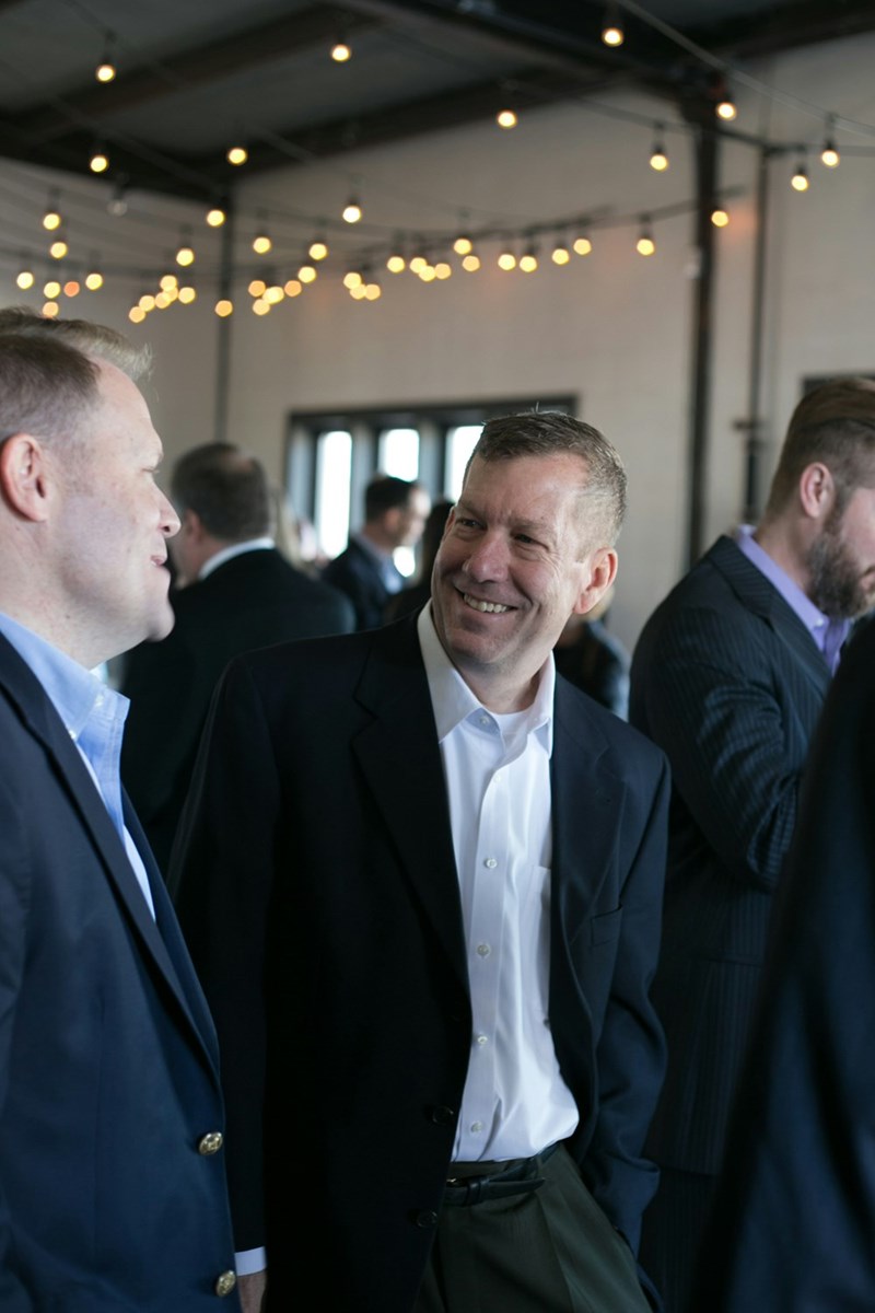 • Two professional men discussing affairs in suits at an event with string lights