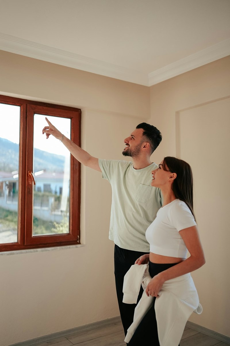 Couple in an apartment looking out of the window -