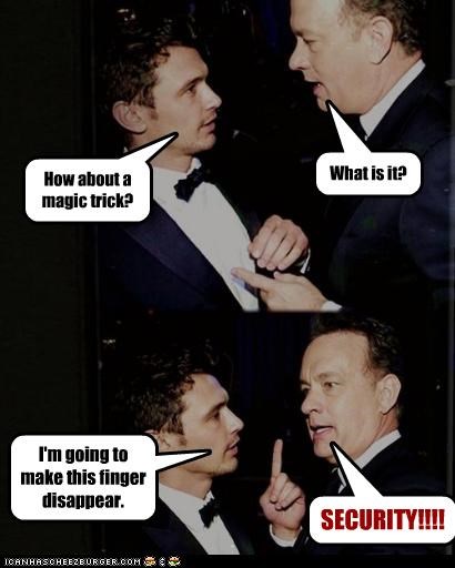 how about a magic trick. what is it? i'm going to make this finger disappear. security! (James Franco, Tom Hanks)