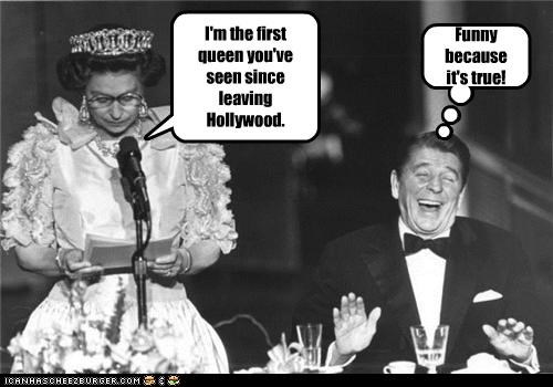 I'm the first queen you've seen since leaving Hollywood. Funny because it's true! (Queen Elizabeth II and Ronald Reagan)
