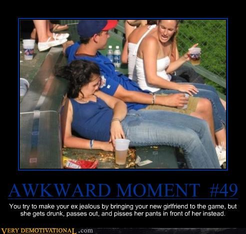 AWKWARD MOMENT #49 you try to make your ex jealous by bringing your new girlfriend to the game, but she gets drunk, passes out, and pisses her pants in front of her instead.