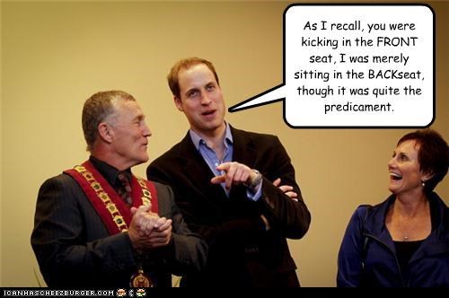 As I recall, you were kicking in the FRONT seat, I was merely sitting in the BACKseat, though it was quite the predicament. (Prince William)