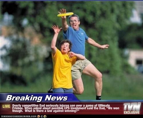 Breaking News - Overly competitive Dad seriously injures son over a game of Ultimate Frisbee. When asked about possible CPS involvment said the Dad, "We won though. What is there a law against winning?"