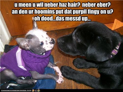 u meen u wil neber haz hair? neber eber? an den ur hoomins put dat purpil fingy on u? oh dood...das messd up...
