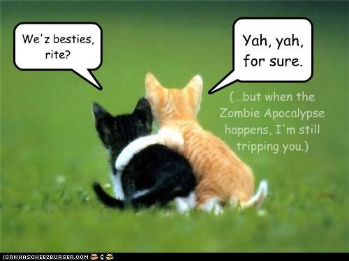 We'z besties, rite? Yah, yah, for sure. (...but when the Zombie Apocalypse happens, I'm still tripping you.)