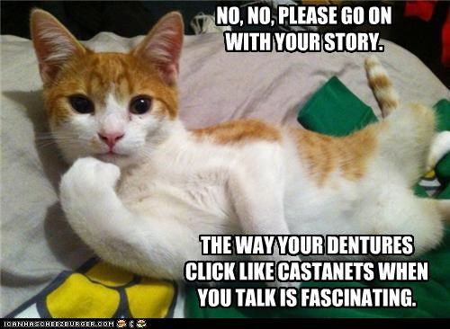 NO, NO, PLEASE GO ON WITH YOUR STORY. THE WAY YOUR DENTURES CLICK LIKE CASTANETS WHEN YOU TALK IS FASCINATING.