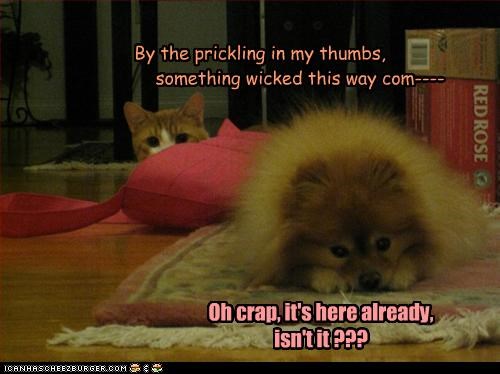 By the prickling in my thumbs, something wicked this way com---- Oh crap, it's here already, isn't it???
