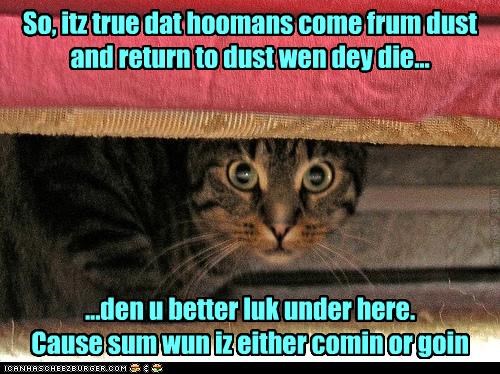 So, itz true dat hoomans come frum dust and return to dust wen dey die... ...den u better luk under here. Cause sum wun iz either comin or goin