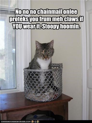 No no no chainmail onlee proteks you frum meh claws if YOU wear it. Stoopy hoomin.