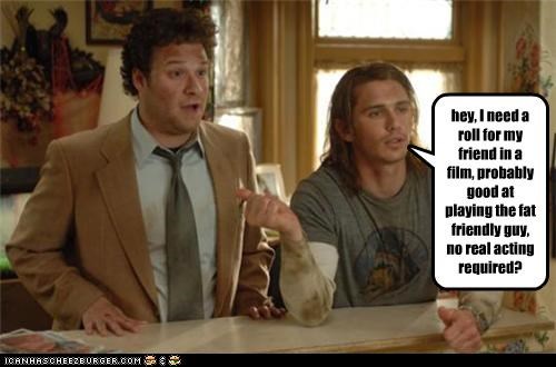 hey, I need a roll for my friend in a film, probably good at playing the fat friendly guy, no real acting required? -Seth Rogen, James Franco