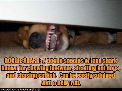 GOGGIE SHARK: A docile species of land shark known for chewing footwear, stealilng hot dogs, and chasing catfish. Can be easily subdued with a belly rub.