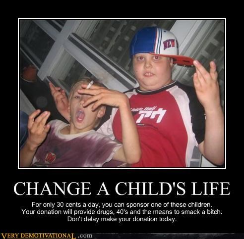 CHANGE A CHILD'S LIFE For only 30 cents a day, you can sponsor one of these children. Your donation will provide drugs, 40's, and the means to smack a bitch. Don't delay, make your donation today.