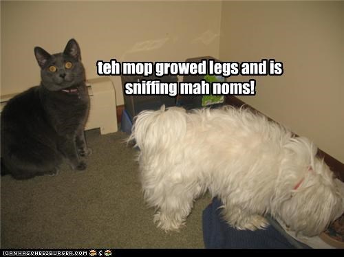 teh mop growed legs and is sniffing mah noms!