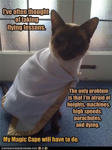 I've often thought of taking flying lessons. The only problem is that I'm afraid of heights, machines, high speeds, parachutes, and dying. My Magic Cape will have to do.