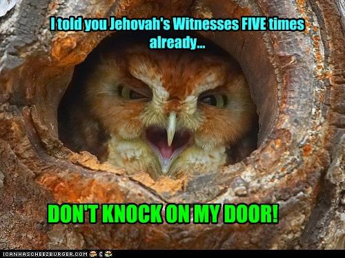 I told you Jehovah's Witnesses FIVE times already... DON'T KNOW ON MY DOOR!