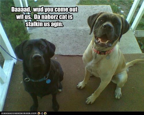 Daaaad, wud you come out wif us. Da naborz cat is stalkin us agin.
