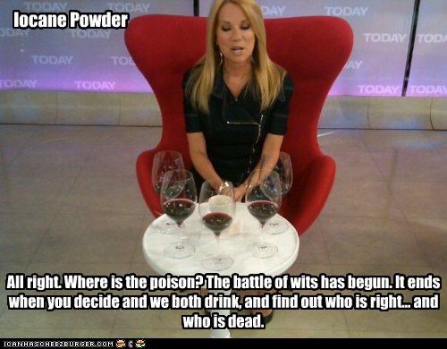 All right. Where is the poison? The battle of wits has begun. It ends when you decide and we both drink, and find out who is right... and who is dead. -Kathy Lee Gifford