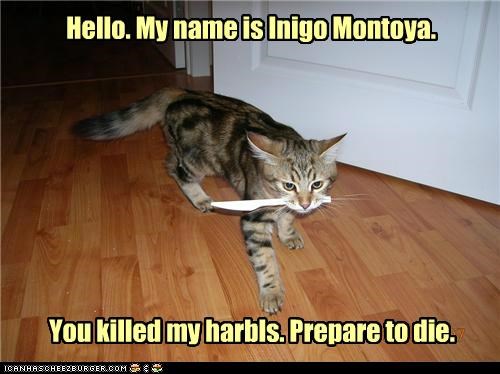 Hello. My name is Inigo Montoya. You killed my harbls. Prepare to die.