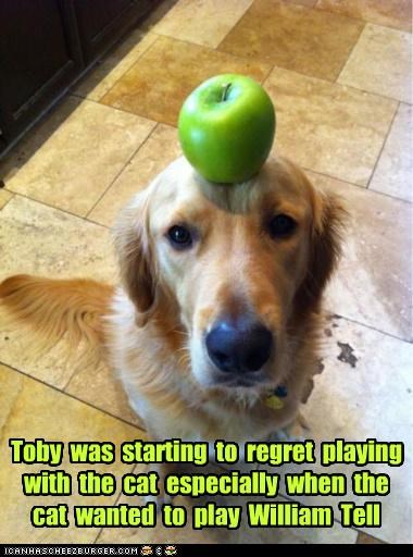 Toby was starting to regret playing with the cat especially when the cat wanted to play William Tell