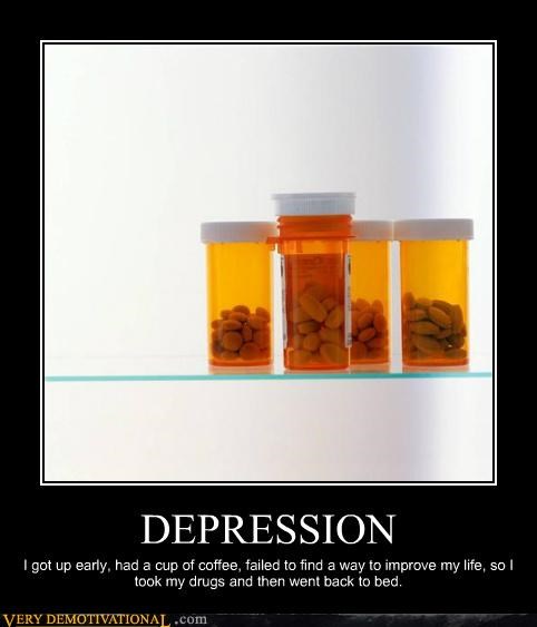 DEPRESSION I got up early, had a cup of coffee, failed to find a way to improve my life, so I took my drugs and then went back to bed.