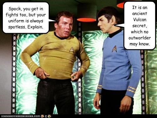 Spock, you get in fights too, but your uniform is always spotless. Explain. It is an ancient Vulcan secret, which no outworlder may know. -William Shatner, Leonard Nimoy
