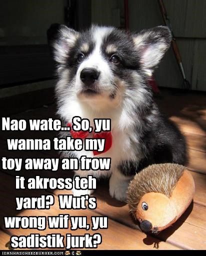 Nao wate... So, yu wanna take my toy away an frow it akross teh yard? Wut's wrong wif yu, yu sadistik jurk?