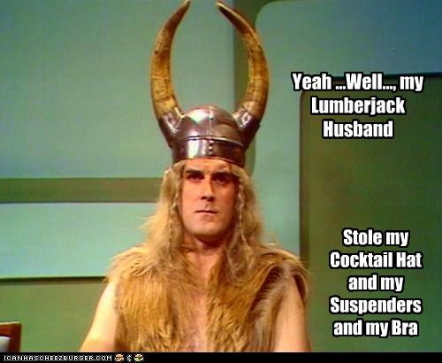 Yeah, well, my lumberjack husband stole my cocktail hat and my suspenders and my bra -John Cleese