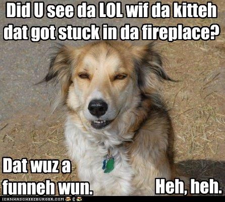 Did U see da LOL wif da kitteh dat got stuck in da fireplace? Dat wuz a funneh wun. Heh, heh.