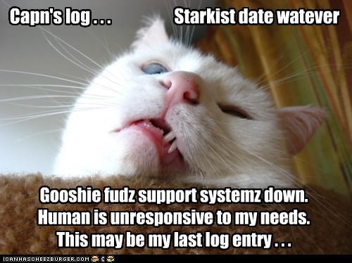 Capn's log... Starkist date watever Gooshie fudz support systemz down. Human is unresponsive to my needs. This may be my last log entry. . .