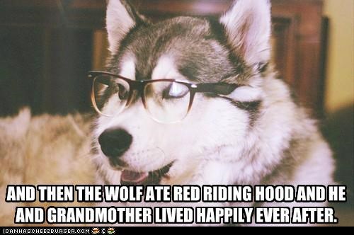 AND THEN THE WOLF ATE RED RIDING HOOD AND HE AND GRANDMOTHER LIVED HAPPILY EVER AFTER.