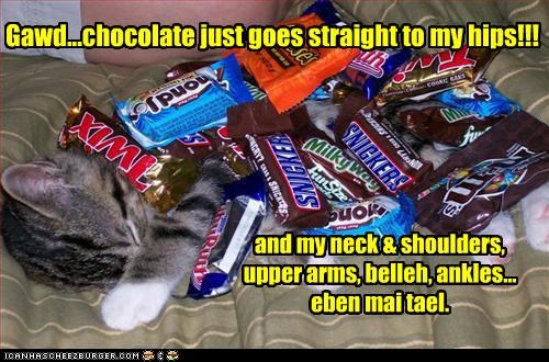 Gawd...chocolate just goes straight to my hips!!! and my neck & shoulders, upper arms, belleh, ankles... eben mai tael.