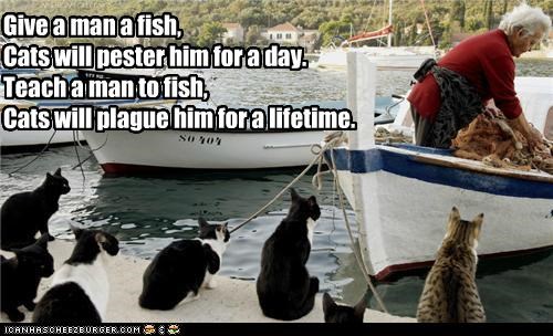 Give a man a fish, Cats will pester him for a day. Teach a man to fish, Cats will plague him for a lifetime.