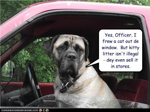 Yes, Officer, I frew a cat out de window. But kitty litter isn't illegal - dey even sell it in stores.