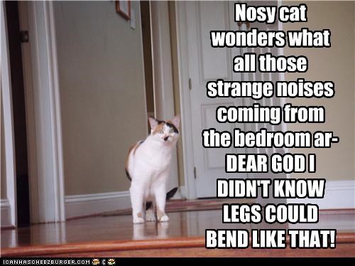 Nosy cat wonders what all those strange noises coming from the bedroom ar-DEAR GOD I DIDN'T KNOW LEGS COULD BEND LIKE THAT!