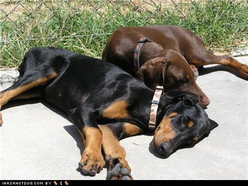 Ohai hotdogz! Des two happy Dobiues are sisters name Taco and Pepper! Luks liek dey r resting after habing some fun! Don't Taco and Pepper luk beyootiful? Happy Dobie week eberybuddeh! We hoap u r enjoyin dese lubbly goggiez!